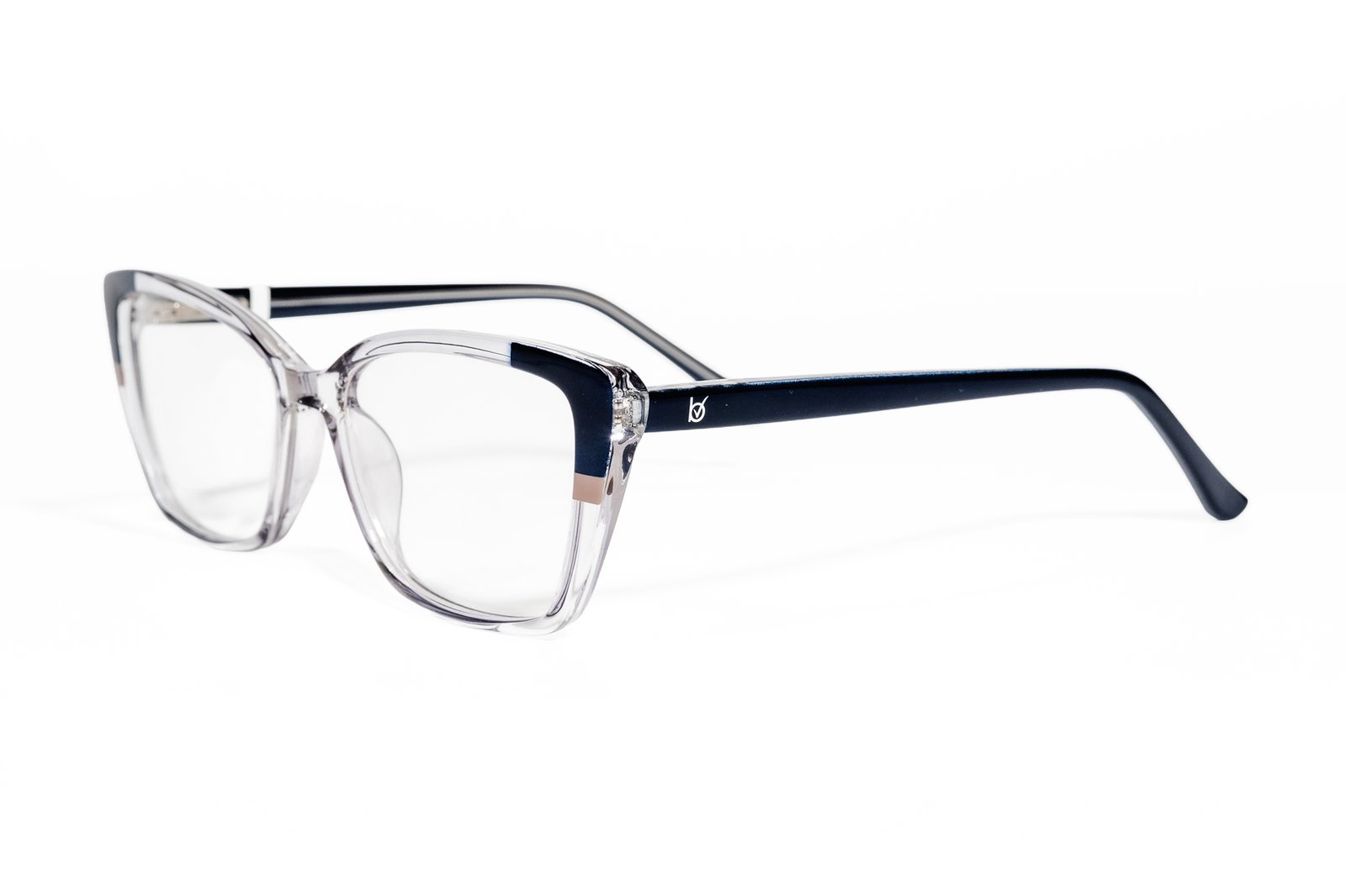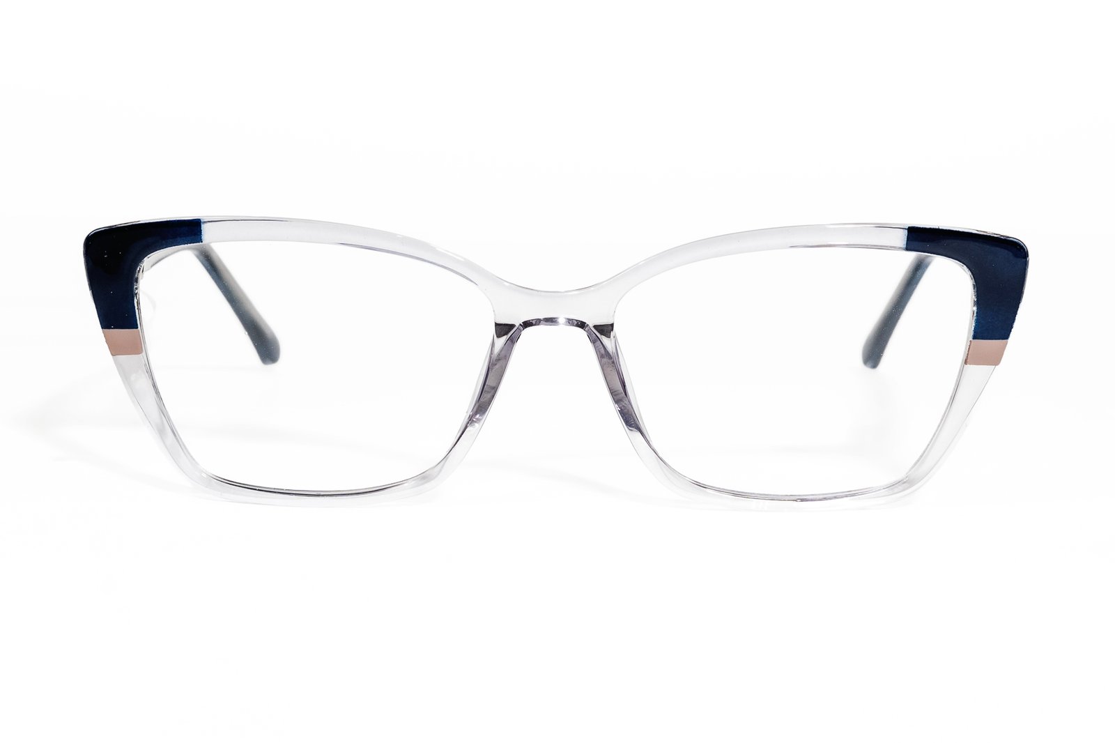 Cristal claro que respira. Acentos azul marino y beige en las esquinas que hablan sin gritar. Geometría cuadrada precisa, brazos de color que funcionan. Para quienes saben que lo mejor no necesita pretender. Limpio, accesible, versátil.